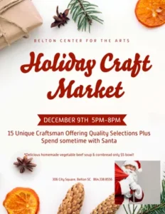 - Tuesday, December 6-5:00 to 8:00 Holiday Craft Market featuring 15 of Belton’s finest craft vendors showcasing special holiday sale items! Shop for one-of-a-kin gifts, let the children visit with Santa Claus and purchase a bowl of season homemade vegetable soup and cornbread.